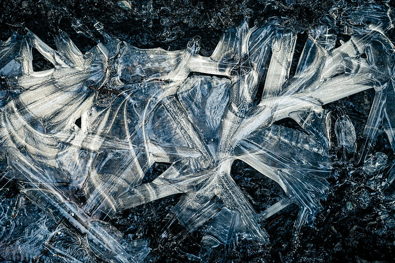Eis und Schneestrukturen finden sich jetzt sehr häufig, lohnen sich aber häufig als Fotomotiv. Von der Schneefläche mit durch den Wind geformten Wellen, über Eisstrukturen auf Seen, bis hin zu kleinen Pfützen, die senkrecht von spannende Bilder ergeben.