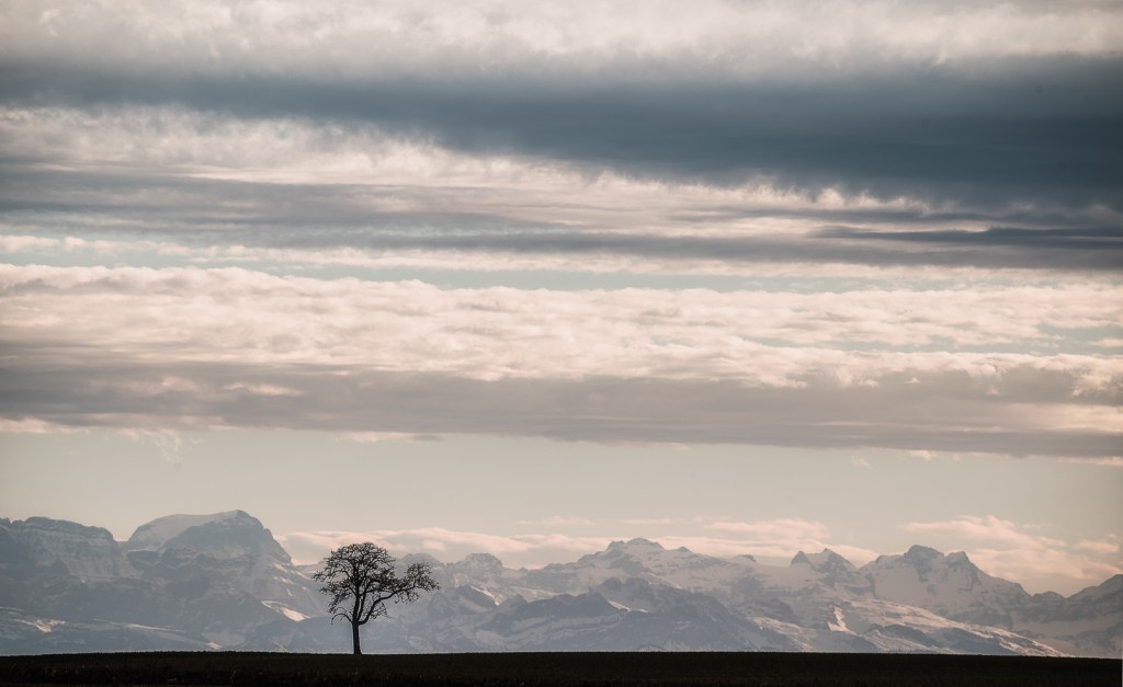 Das selbe Motiv mit dem selben Objektiv, aus einer ähnlichen Entfernung aber etwas anderer Perspektive und vor allem einer Vollformatkamera. Hier wirken die Berge weniger „mächtig“, aber der Baum hat das identische Größenverhältnis zu den Bergen wie bei APS-C.