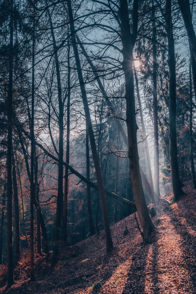 Waldfotografie lebt von der Lichtstimmung. Besonders eignen sich hier neblige oder dunstige Tage mit tief stehender Sonne. Meist ist es auch eine gute Idee, den Himmel nicht mit ins Bild zu nehmen, da er – als hellster Punkt- meist zu viel Aufmerksamkeit auf sich zieht.