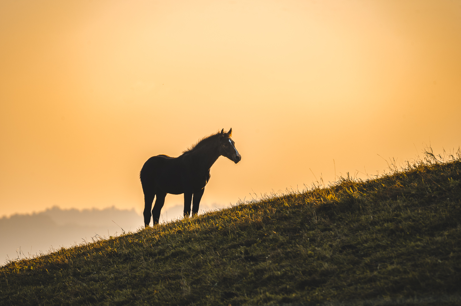 Auf der Rückfahrt von einer Fotoexkursion standen plötzlich die Fohlen auf der Weide, dahinter die untergehende Sonne…