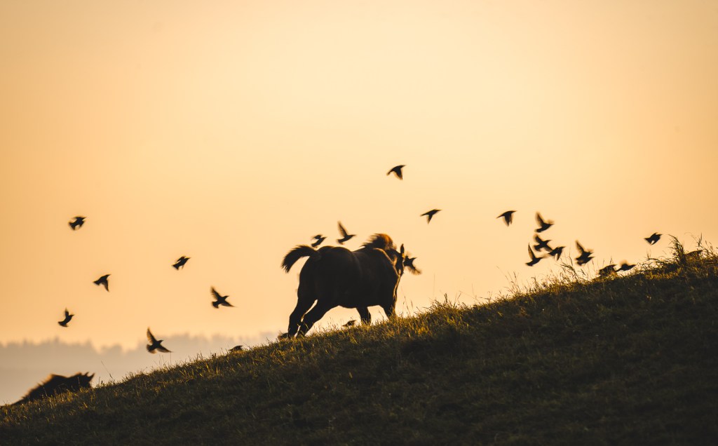 Im nächsten Moment hat das Fohlen die Vögel dann wild bockend aufgescheucht.