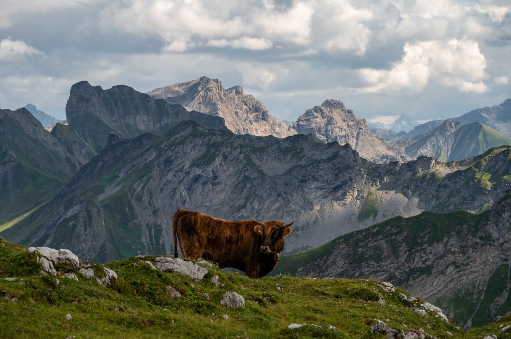 In der Bergfotografie sind Kühe dagegen eher beliebt, immerhin ist die Kuh ja seit jüngsten Kindheitstagen mit „Heidi“ ein Symbol für die Bergbauernwirtschaft. Diese Exemplare hier haben wir im Allgäu angetroffen, da wir den Hund dabei hatten, waren wir nochmals eine Spur vorsichtiger.