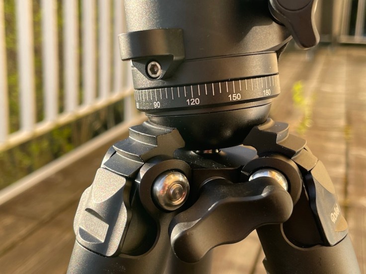 Das Stativ hat eine fixen, nicht wechselbaren Kugelkopf, das liegt an dessen spezieller Konstruktion, er bildet nämlich an der Basis zusammen mit der Stativschulter eine Nivelliereinheit.
