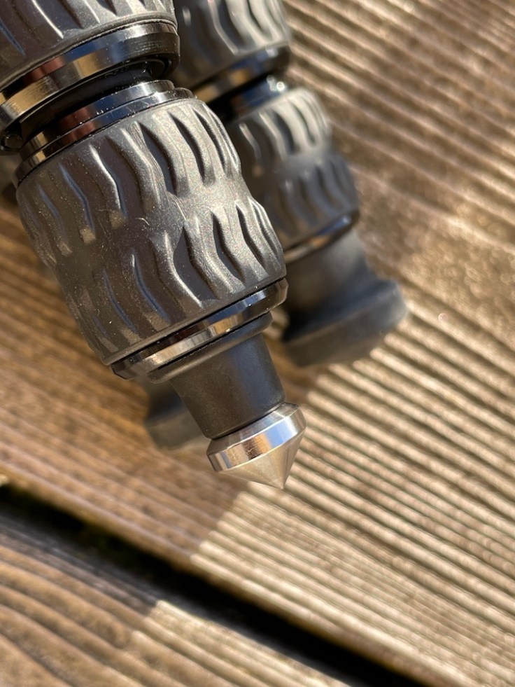 Das Stativ hat „nur“ Spikes mit einer Gummikappe, aber in dieser Klasse sind wechselbare Spikes nicht üblich und häufig sind es auch nur Gummifüße (oder diese unerträglichen „Hybridfüße“ bei denen man den Gummiteller immer „nach oben“ schraubt – und sich der gesamte Dreck darin ansammelt).