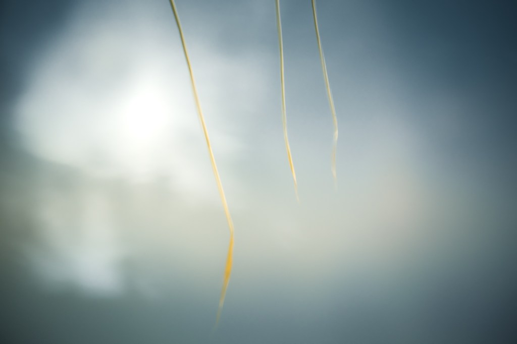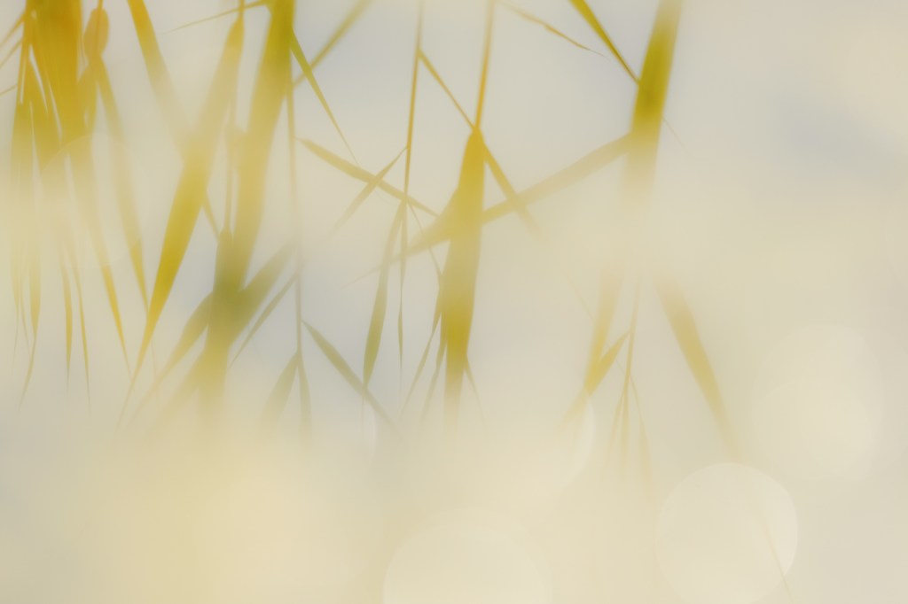 Hier spiegeln sich die Schilfhalme im Gartenteich, durch die Spiegelung und Farbgestaltung bekommt das Bild etwas abstraktes und sehr ätherisches.