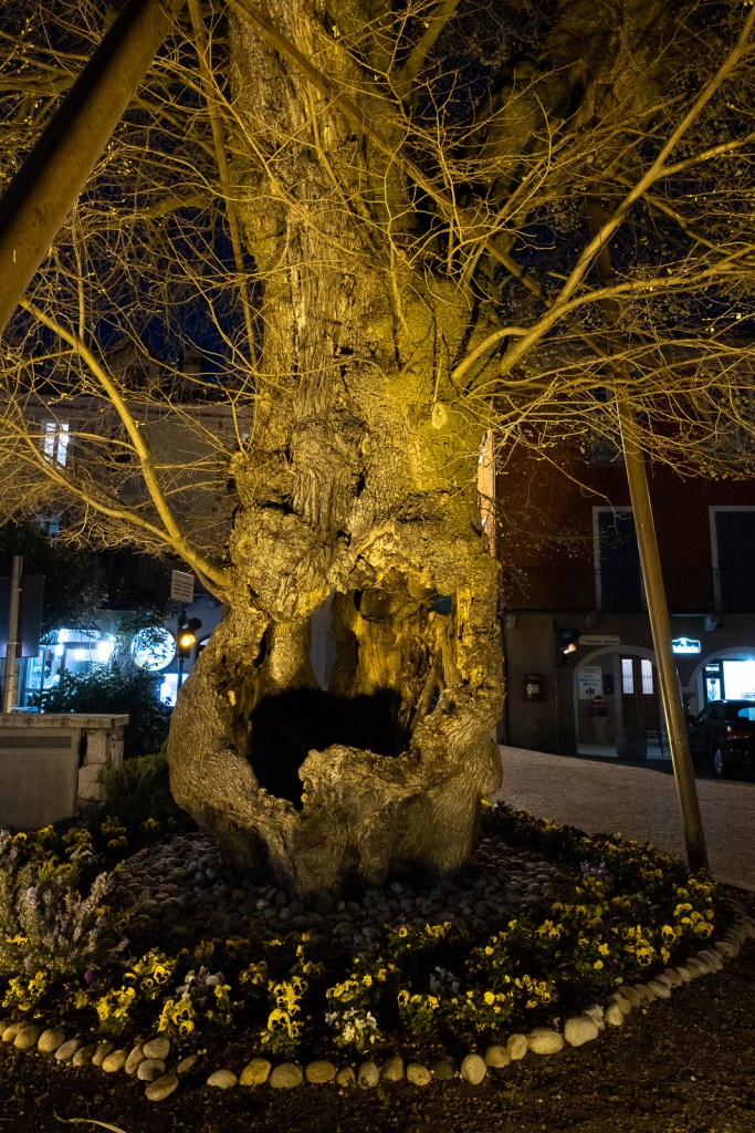 Der Baum ist abends angestrahlt, allerdings mit einem recht warmen Licht, die Lichter der Cafés im Hintergrund ist deutlich kühler, daher habe ich durch einen (versucht) relativ neutralen Weißabgleich hier ein mystisches, sehr bläuliches Licht erhalten, dass durch die Löcher im Stamm tritt erhalten.