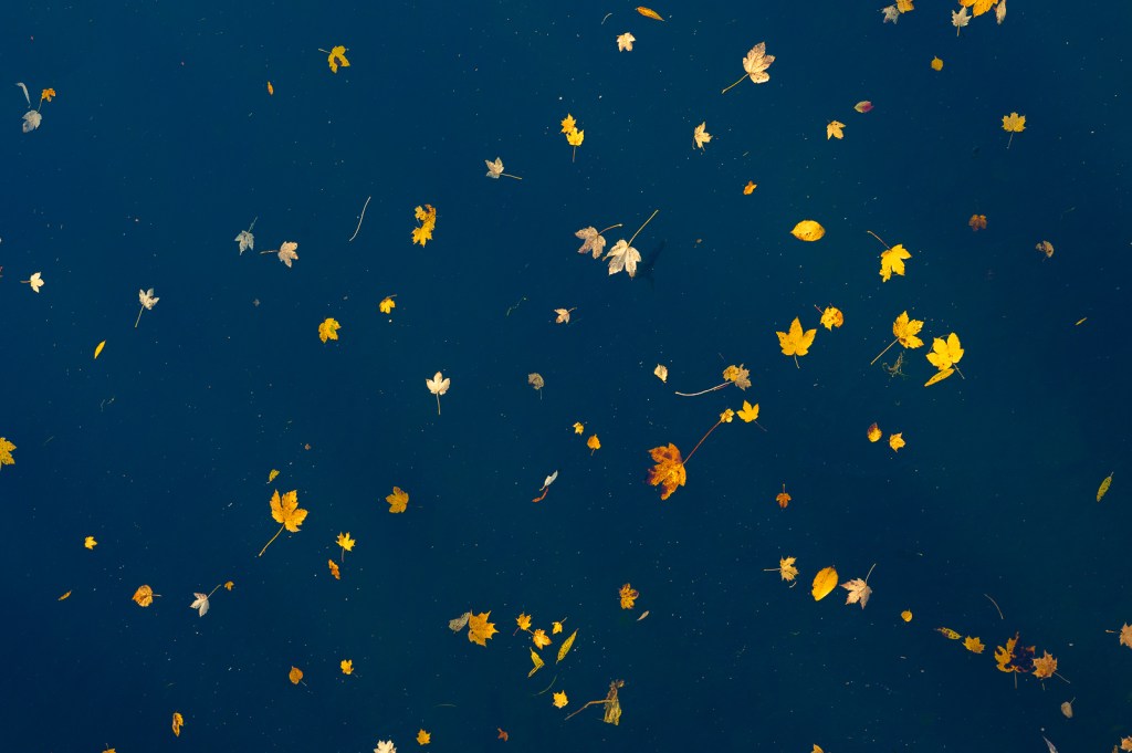 Wie auf einer schwarzen Leinwand liegen die Herbstblätter da – in Wirklichkeit ist das aber Wasser, genauer Blätter die in der Donau getrieben sind, von einer Brücke aus fotografiert.