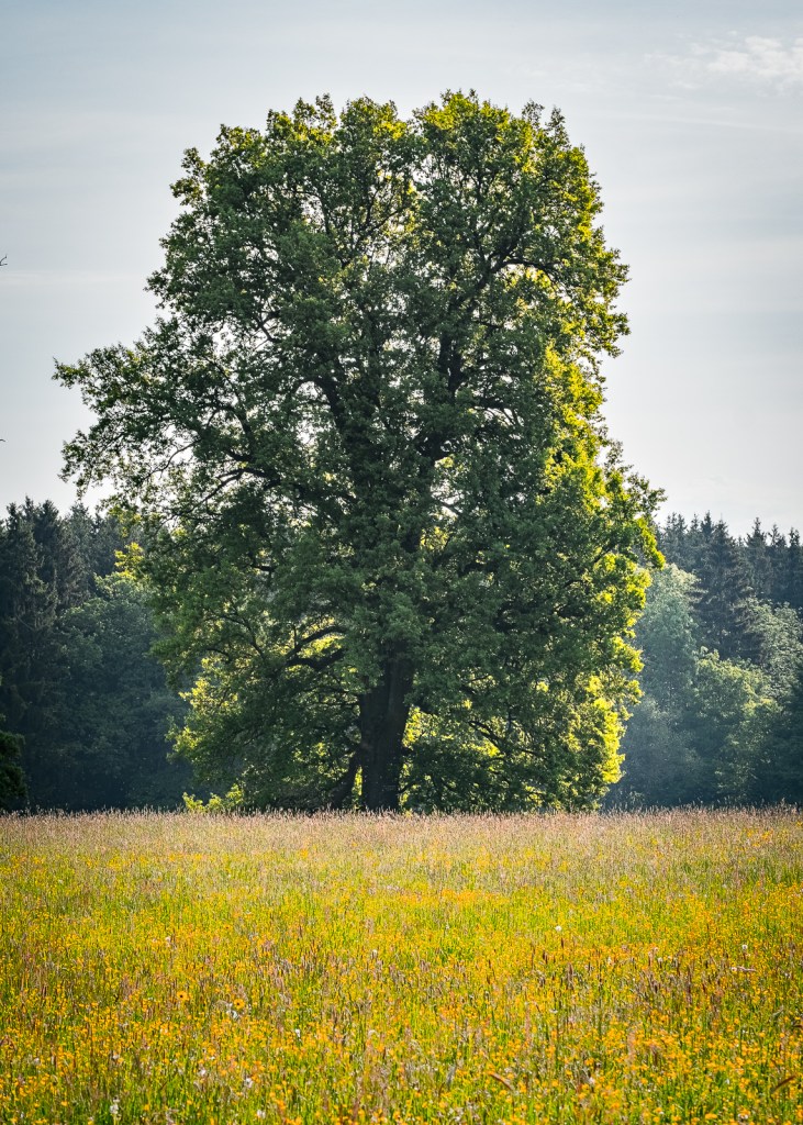 Letzte Woche morgens an der „Josefslust“ – hier steht eine tote Eiche neben einer lebendigen. Dazu die Wildblumenwiese im Vordergrund…