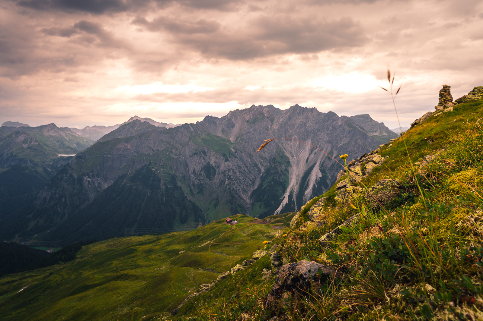 Blick auf die Kaltenbergerhütte und die Arlbergregion.