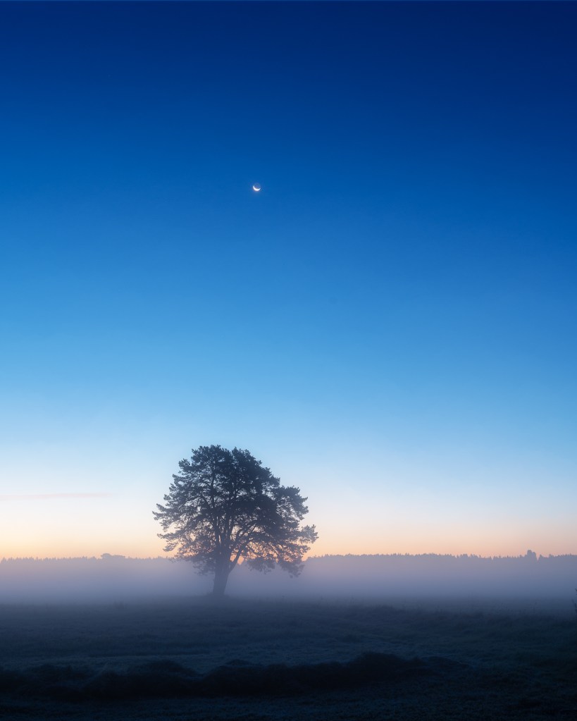 In diesem Bild musste ich einen kleinen „Kniff“ anwenden um einen gewünschten Bildaufbau zu bekommen. Der abnehmende bzw. aufgehende Mond steht in der blauen Stunde eigentlich deutlich höher – erst nahe an Voll-/ Neumond steht er dann tiefer.
