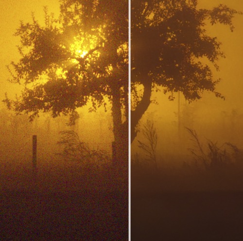 Eigentlich mag ich ja keine Bilder mit menschlichen Spuren (außer vielleicht Wegen oder tollen klassischen Gebäuden) darauf. Aber gestern früh beim Spaziergang mit dem Hund musste ich die Szene einfach festhalten. Die Straßenlaternen -hier größtenteils Natrium-Dampflampen, daher das sehr orange Licht-, der Nebel und die Struktur des Apfelbaumes haben mich fasziniert.