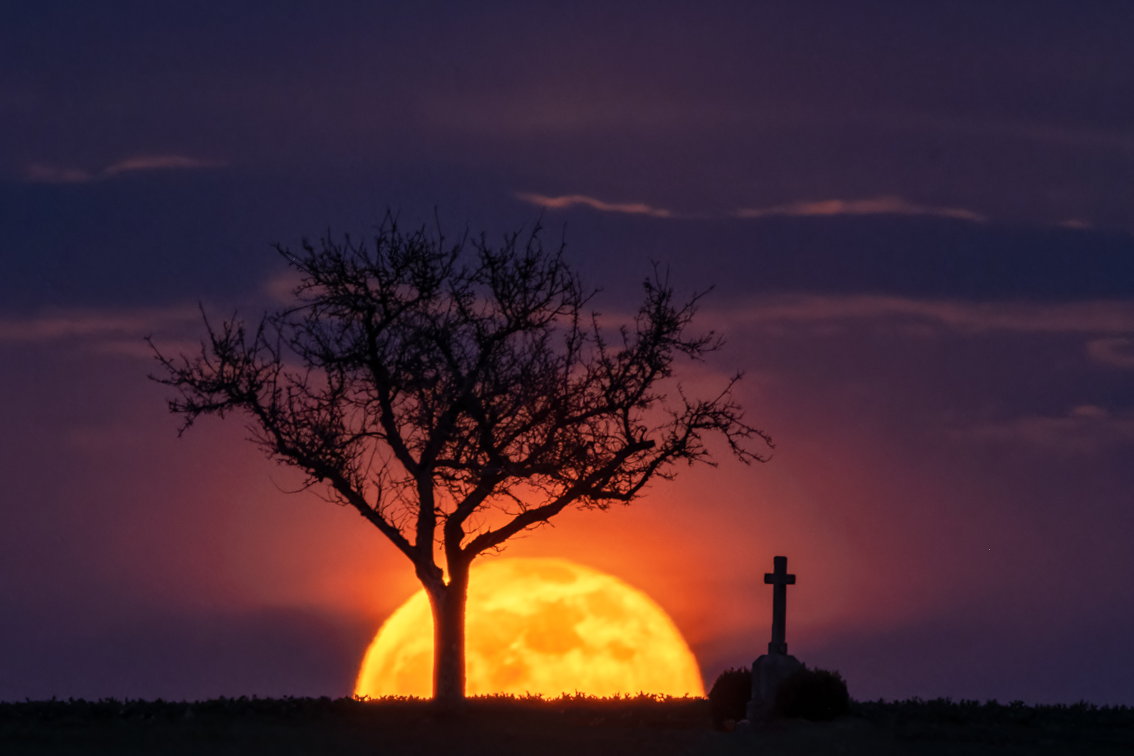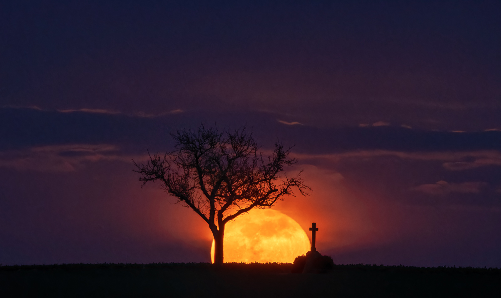 Gute Planung ist unabdingbar, man hat nur einen Zeitslot von ca. 3-5 Minuten, bevor der Mond schon wieder zu hoch steht. Gut, wenn man dann an seinem Spot etwas nach rechts oder links ausweichen kann um den Mond doch noch direkt in der Linie mit dem Baum zu bekommen. Ein Stativ bei dem man schnell die Höhe verstellen kann schadet auch nicht- es geht eben stark um die Perspektive! Daneben ist eine Ortsabweichung von ein paar Metern immer drin, so genau kann die Planung in PhotoPills oder ähnlichen gar nicht sein, da muss nur die hinterlegte Höhe ein paar Meter daneben sein. Da freut man sich, wenn man sein Stativ einfach 10m verrücken kann.