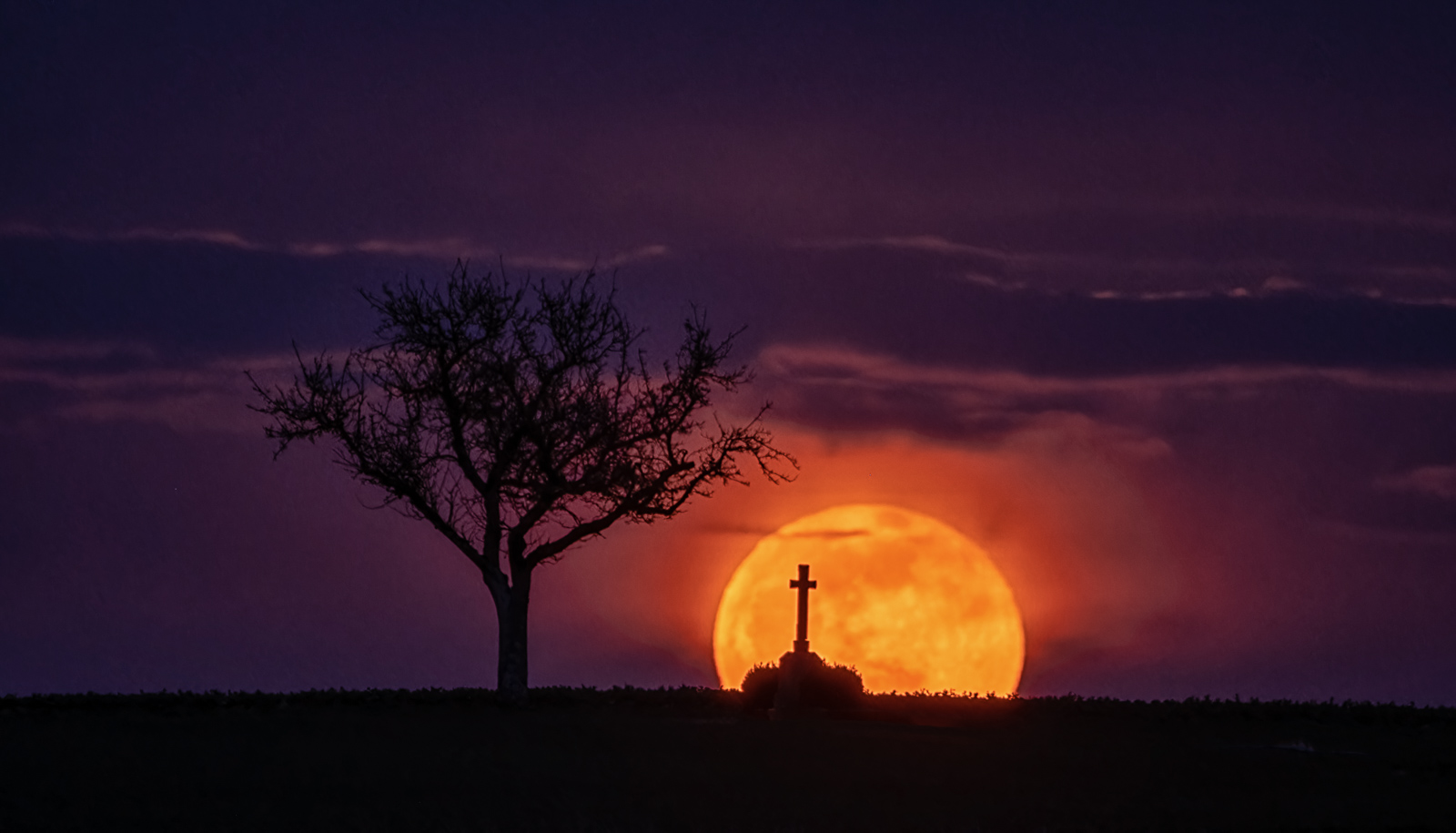 Für mich mit dem Baum als Symbol des Lebens (ist auch ein Apfelbaum) und dem Kreuz, passend zum Frühlingsvollmond, der den Ostertag definiert, ein “ideales” Ostermotiv.