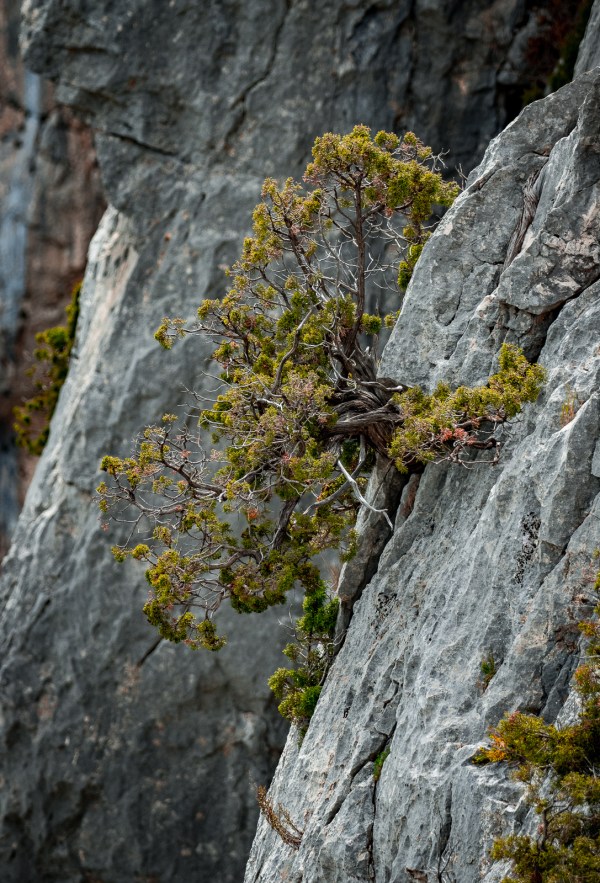 2022-09-02 Schon seit Jahren, wenn nicht sogar Jahrzehnten klammert sich dieser Wacholderbaum in den Fels der Gorges du Verdon. Beeindruckend! Nikon Z fc + Tamron 100-400mm am FTZ2, 210mm, ISO500, f/5.6, 1/1000s