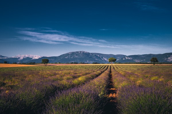 2022-07-10 Drei Bäume auf der Hochebene von Valensole, im Hintergrund die "weißen Berge" der letzten Ausläufer der Westalpen (mit den Nationalparks Ecrins und Mercantour). Nikon Z6 + Z24-200mm@62mm, ISO100, f/9.5, 1/500s Eine klassische Landschaftsaufnahme mit Vorder-, Mittel- und Hintergrund.