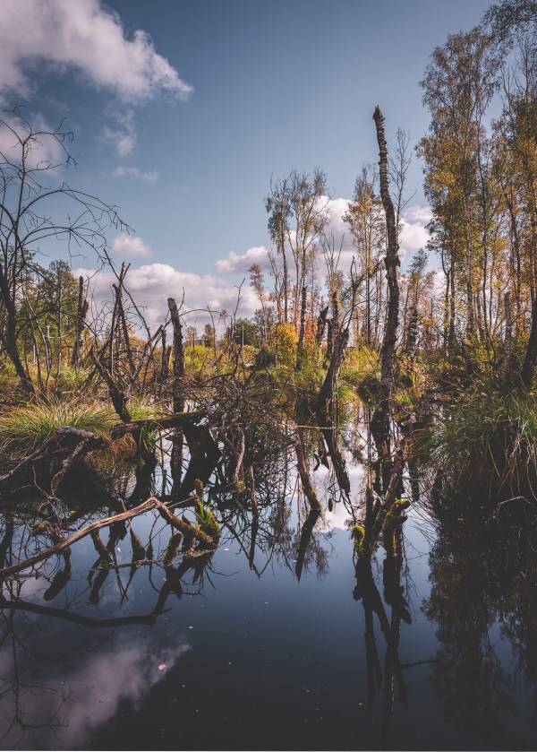2022-11-06 Das passiert, wenn ein Wald wieder vernässt wird - viele tote oder sterbende Bäume. Tatsächlich ist die Wiedervernässung aber wichtig um das Moor zu renaturieren und auch dessen CO2 - Aufnahme- Fährigkeit zu erhalten. Nikon Z6 + Z24-120mm@24mm, ISO100, f/5.6, 1/1500s