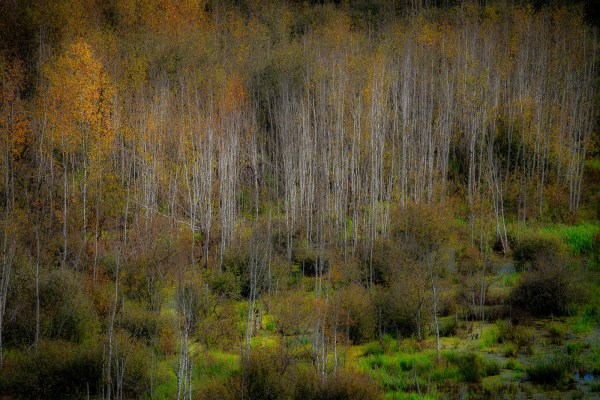 2022-09-28 Impressionistische Aufnahme eines Birkenwäldchens im Pfrunger Ried. Hier mit "ICM" (intended camera movement). Die Kamera wurde während der Aufnahme verschwenkt, hier auf einem Videoneiger. Nikon Z6 + AF-S 70-300@125mm, ISO50, f/16, 1/4s