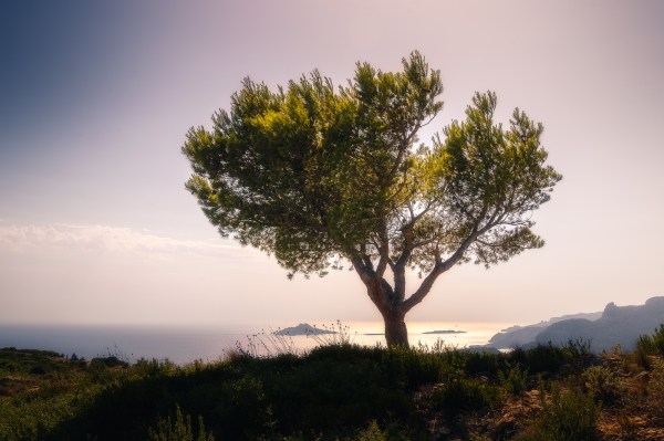2022-07-12 Diese Kiefer thront über Cassis und liegt direkt an der berühmten "Route de Crêtes".Leider (also fürs Photo, nicht für die Kiefer) ist sie nicht alleinstehend, aber sie hebt sich dennoch gut vor dem Meer ab! Nikon Z6 + Z24-200mm@24mm, ISO100, f/8, 1/250s