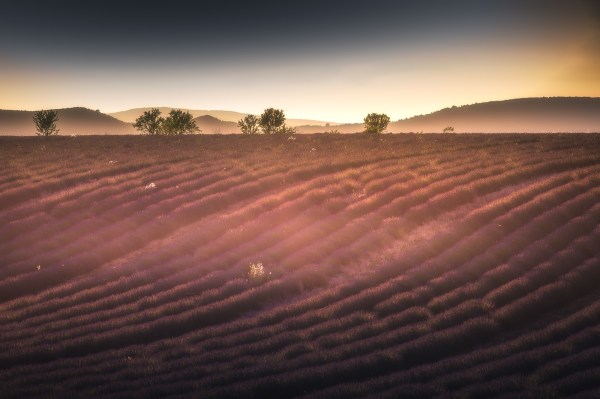 2022-07-07 Magische Stimmung über den Lavendelfeldern von Valensole. Die Sonne versinkt langsam und der Dunst steigt auf. Durch die tiefstehende Sonne erhält der Lavendel eine sehr plastische Struktur und durch den Dunst wird zusätzlich Tiefe im Hintergrund erzeugt. Nikon Z6 + Z24-200mm@200mm, ISO100, f/8, 1/180s