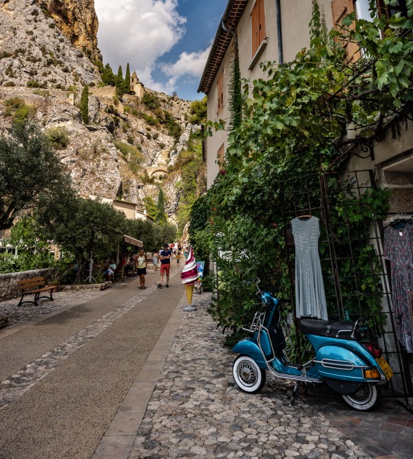 2022-09-07 Vespa - wer mag die Kultroller nicht, zumal wenn sie so dekorativ in einer hübschen französischen Stadt (Moustiers Sainte Marie, Provence) stehen? Nikon Z6 + Z24-120mm@24mm, ISO100, f/8, 1/250s